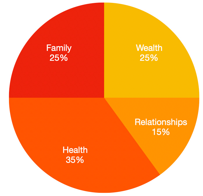 The math: 35% Health, 25% Family, 25% Wealth, 15% Relationships